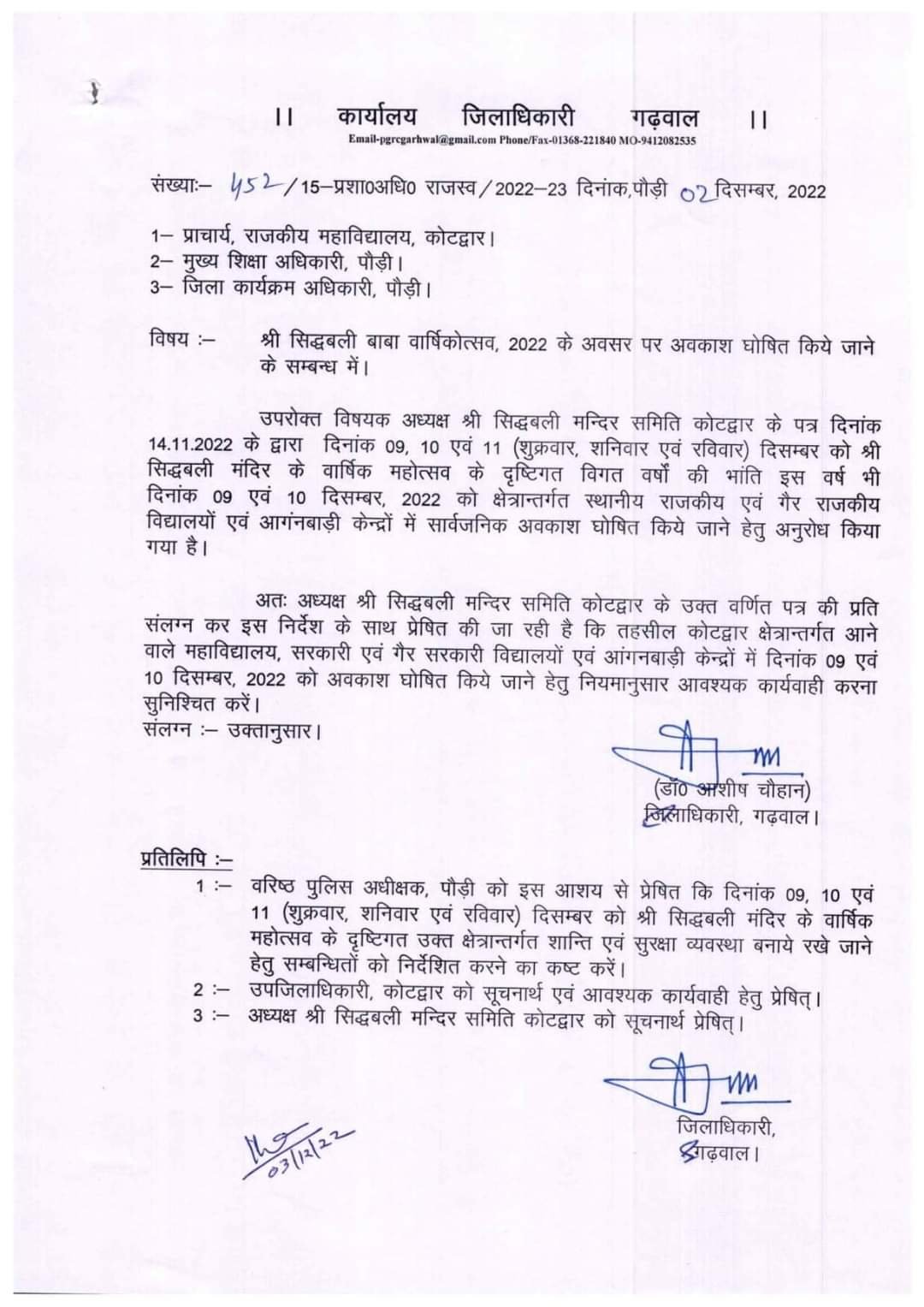 पौड़ी गढ़वाल: दुनिया भर के लोगों की आस्था के प्रतीक विश्व प्रसिद्ध श्री सिद्धबली बाबा मेले के अवसर पर जिलाधिकारी पौड़ी गढ़वाल ने दो दिनी अवकाश की घोषणा की है। आदेश के मुताबिक तहसील कोटद्वार क्षेत्रान्तर्गत आने वाले महाविद्यालय, सरकारी एवं गैर सरकारी विद्यालयों एवं आंगनबाड़ी केन्द्रों में दिनांक 09 एवं 10 दिसम्बर, 2022 को अवकाश रहेगा।