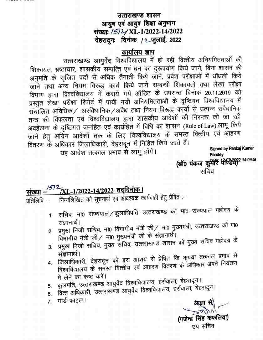 उत्तराखंड आयुर्वेदिक विश्वविद्यालय यूं तो अपनी स्थापना के समय से ही विवादों में रहा है, लेकिन इन दिनों विश्वविद्यालय को लेकर शासन की तरफ से जिस तरह निगाहें टेढ़ी की गई है। उससे विश्वविद्यालय और शासन आमने-सामने आ गए हैं। स्थिति यह है कि पिछले कुछ समय से आयुर्वेद विश्वविद्यालय के खिलाफ शासन की तरफ से एक के बाद एक जांच के पत्र जारी किए जा रहे हैं। हाल ही में रिटायर जस्टिस केडी शाही की अध्यक्षता में एक जांच कमेटी भी गठित की गई है। जिसके लिए राज्यपाल से भी स्वीकृति ली गई थी। लेकिन विवाद तब शुरू हुआ जब शासन ने आयुर्वेद विश्वविद्यालय में वित्तीय अधिकारों को जिलाधिकारी देहरादून में निहित करने का आदेश जारी किया है।