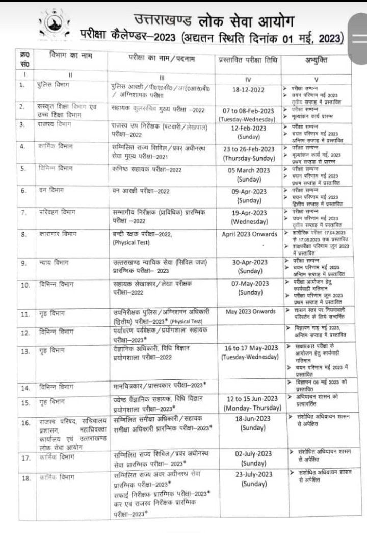भर्ती परीक्षाओं की तैयारी कर रहे युवाओं के लिए काम की खबर है। बता दें कि उत्तराखंड लोक सेवा आयोग ने कई भर्ती परीक्षाओं का संशोधित कैलेंडर जारी किया है। नए कैलेंडर में आयोग ने पेपर लीक की वजह से रद्द हुई एई भर्ती परीक्षा को भी शामिल किया गया है। आइए जानते है कब कौन सा पेपर होगा। मिली जानकारी के अनुसार वार्षिक कैलेंडर के अनुसार मई महीने के दौरान पिछले लंबे समय से परीक्षा परिणाम का इंतजार कर रहे युवाओं का इंतजार खत्म होने वाला है। बताया जा रहा है कि आयोग ने एई भर्ती परीक्षा को 13 से 18 अगस्त के बीच कराने का ऐलान किया है। बता दें कि उत्तराखंड लोक सेवा आयोग ने 32 भर्तियों का संशोधित कैलेंडर जारी कर दिया है, जिनमें से नौ भर्तियां कराई जा चुकी हैं। देखें किस दिन कौन सा होगा एग्जाम…