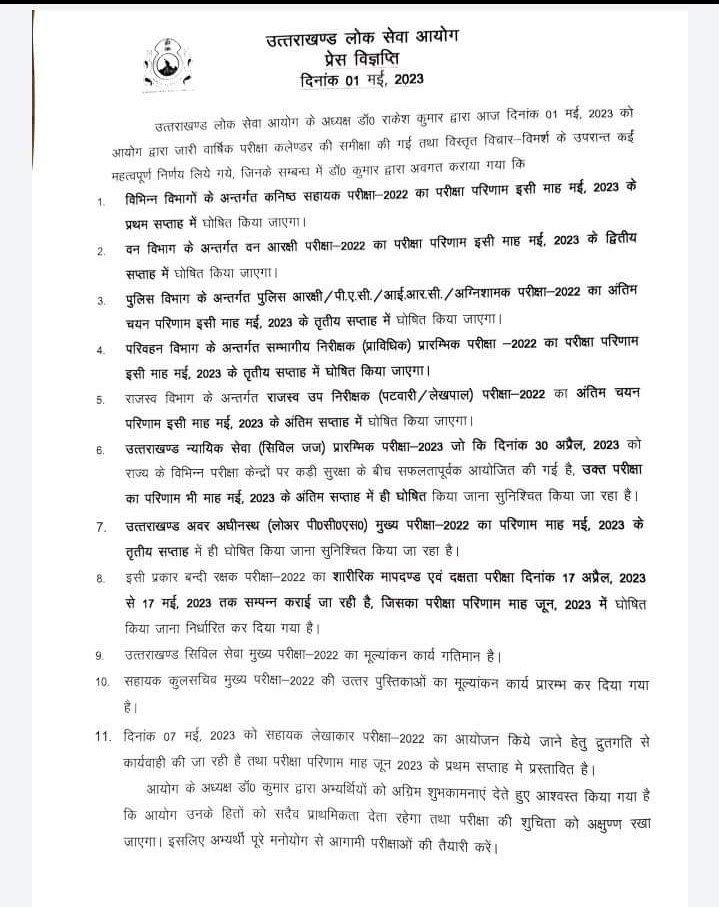 भर्ती परीक्षाओं की तैयारी कर रहे युवाओं के लिए काम की खबर है। बता दें कि उत्तराखंड लोक सेवा आयोग ने कई भर्ती परीक्षाओं का संशोधित कैलेंडर जारी किया है। नए कैलेंडर में आयोग ने पेपर लीक की वजह से रद्द हुई एई भर्ती परीक्षा को भी शामिल किया गया है। आइए जानते है कब कौन सा पेपर होगा। मिली जानकारी के अनुसार वार्षिक कैलेंडर के अनुसार मई महीने के दौरान पिछले लंबे समय से परीक्षा परिणाम का इंतजार कर रहे युवाओं का इंतजार खत्म होने वाला है। बताया जा रहा है कि आयोग ने एई भर्ती परीक्षा को 13 से 18 अगस्त के बीच कराने का ऐलान किया है। बता दें कि उत्तराखंड लोक सेवा आयोग ने 32 भर्तियों का संशोधित कैलेंडर जारी कर दिया है, जिनमें से नौ भर्तियां कराई जा चुकी हैं। देखें किस दिन कौन सा होगा एग्जाम…