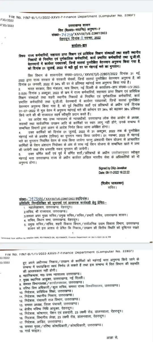 इसी वार्ता मीटिंग में सीएम धामी ने कार्मिकों को DA बढोतरी को लेकर चिंतित न होने का आश्वासन देकर राहत दे दी थी। अब सीएम ने डीए बढोतरी की फाइल का अनुमोदन कर दिया है और आज मंगलवार को गुरु नानक जयंती के मौके पर सार्वजनिक अवकाश होने के बावजूद राज्य स्थापना की पूर्व संध्या पर तीन लाख कर्मचारियों और पेंशनर्स के DA बढोतरी के आदेश औपचारिक तौर पर जारी खुश कर दिया गया है।