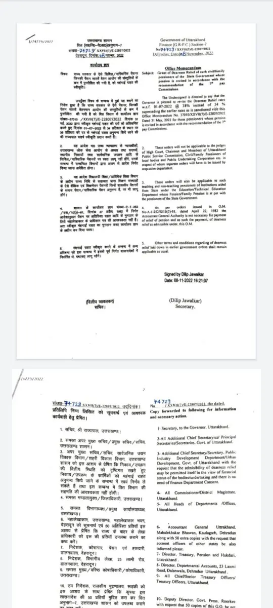 इसी वार्ता मीटिंग में सीएम धामी ने कार्मिकों को DA बढोतरी को लेकर चिंतित न होने का आश्वासन देकर राहत दे दी थी। अब सीएम ने डीए बढोतरी की फाइल का अनुमोदन कर दिया है और आज मंगलवार को गुरु नानक जयंती के मौके पर सार्वजनिक अवकाश होने के बावजूद राज्य स्थापना की पूर्व संध्या पर तीन लाख कर्मचारियों और पेंशनर्स के DA बढोतरी के आदेश औपचारिक तौर पर जारी खुश कर दिया गया है।