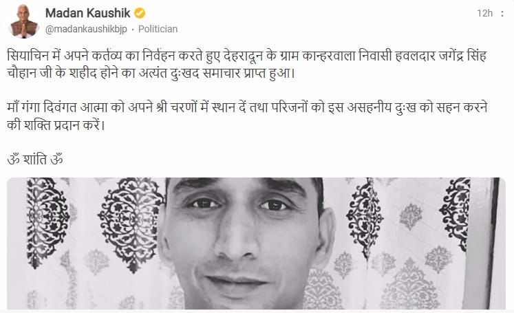 कान्हरवाला भानियावाला निवासी जगेंद्र सिंह चौहान के मामा सेवानिवृत्त कैप्टन मनवीर सिंह बिष्ट ने जगेंद्र सिंह चौहान (35) पुत्र सेवानिवृत्त सूबेदार मेजर राजेंद्र सिंह चौहान के शहीद होने की जानकारी दी। 325 लाइट एडी बैटरी कमांडर मेजर पॉल ने उनको बताया कि शहीद जगेंद्र सिंह चौहान सियाचिन ग्लेशियर में तैनात थे।