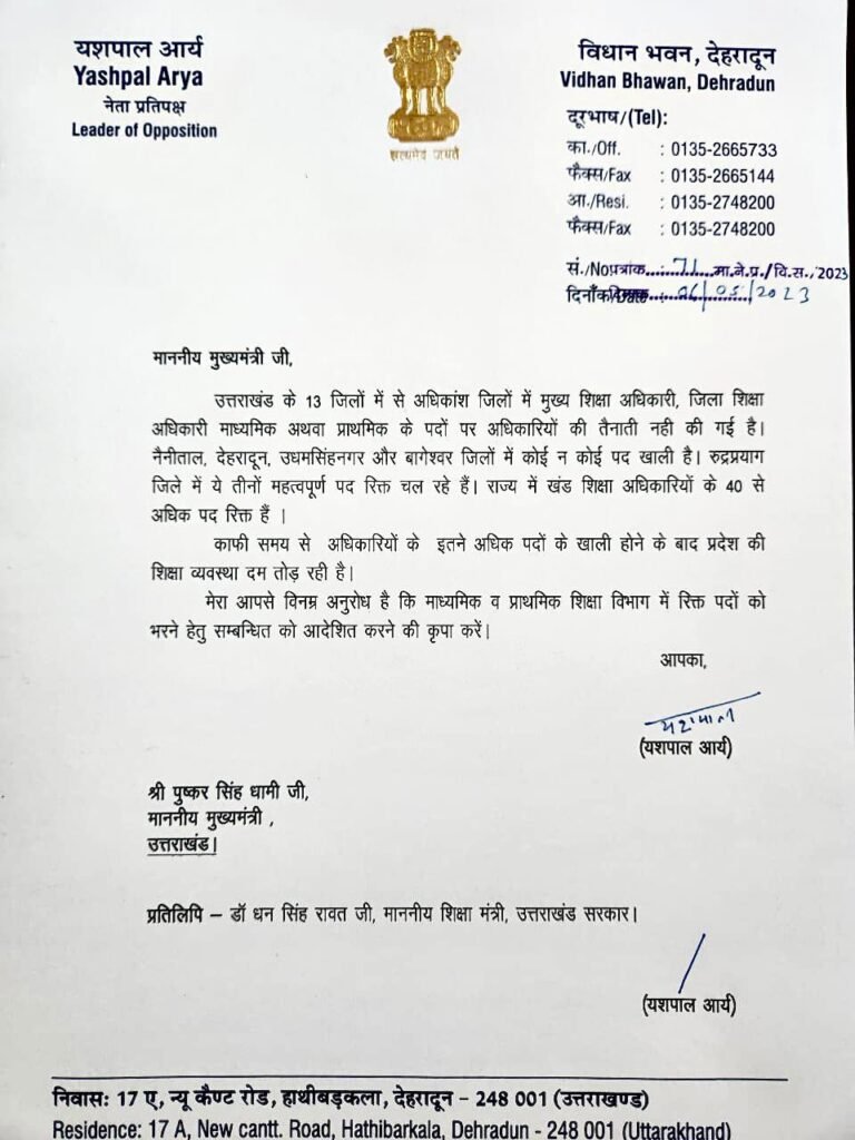नेता प्रतिपक्ष का आरोप है कि काफी समय से ब्लॉक स्तर से लेकर जिले के अधिकारियों के इतने अधिक पदों के खाली होने के कारण प्रदेश की शिक्षा व्यवस्था दम तोड़ रही है। यशपाल आर्य ने निशाना साधा कि उत्तराखंड में जहां एक और शासन नई शिक्षा नीति की बातें कर रहा है, वहीं, जिलों में प्रधानाचार्य, प्रवक्ता, खण्ड शिक्षा अधिकारी सहित तमाम अधिकारियों का टोटा है।उन्होंने कहा कि रिक्त पदों के बावजूद इनको भरने के लिए लंबे समय से कोई प्रयास नहीं किए गए हैं जिसका सीधा असर कहीं न कहीं जिलों के सरकारी स्कूलों से विद्या प्राप्त करने वाले छात्रों पर पड़ रहा है। यशपाल आर्य ने राज्य की शिक्षा व्यवस्था पटरी पर लाने के लिए मुख्यमंत्री पुष्कर सिंह धामी से अतिशीघ्र माध्यमिक व प्राथमिक शिक्षा विभाग में अधिकारियों के रिक्त पदों को भरने की मांग की।